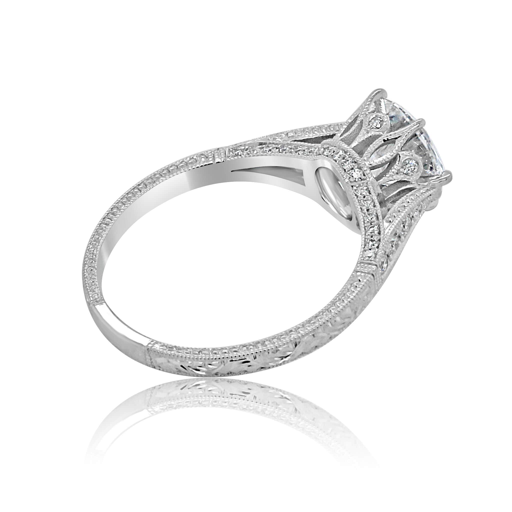 At its center, a certified 2-carat lab-grown diamond shines brilliantly, surrounded by a sparkling diamond halo that adds extra fire and brilliance. The band features intricate hand engraving and delicate milgrain edges, enhancing the antique, vintage-inspired design. Small pavé-set accent diamonds of G-VS quality embellish the halo and band, creating a luxurious sparkle that complements the center stone perfectly.