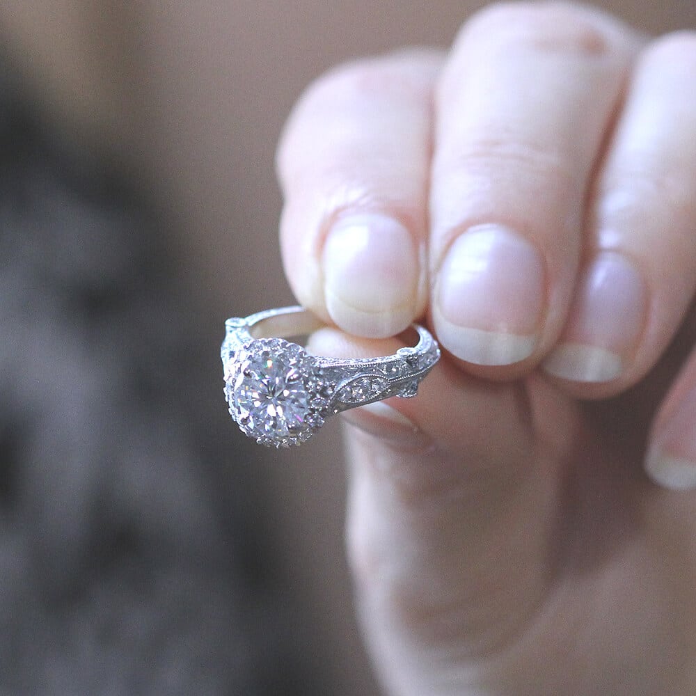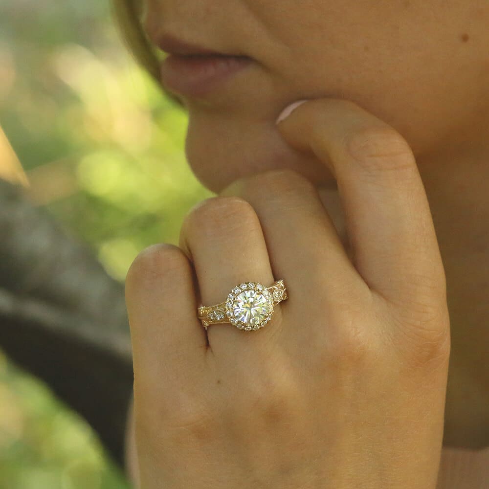 Side Diamonds and Band Diamonds: The ring and matching band are adorned with natural diamonds totaling 0.60Ct with GVS clarity. These natural diamonds beautifully complement the center stone, adding extra sparkle and enhancing the ring’s vintage appeal.