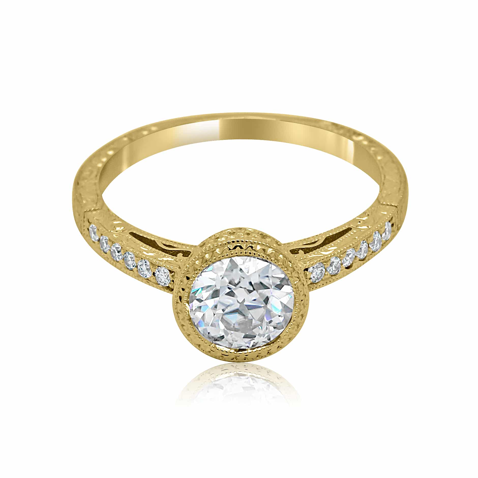 This vintage-inspired engagement ring features a 1ct round lab-grown diamond set in a polished bezel, blending classic Art Deco design with modern craftsmanship. The band is accented with pavé-set SI1 diamonds and finished with detailed hand engraving and milgrain edges.