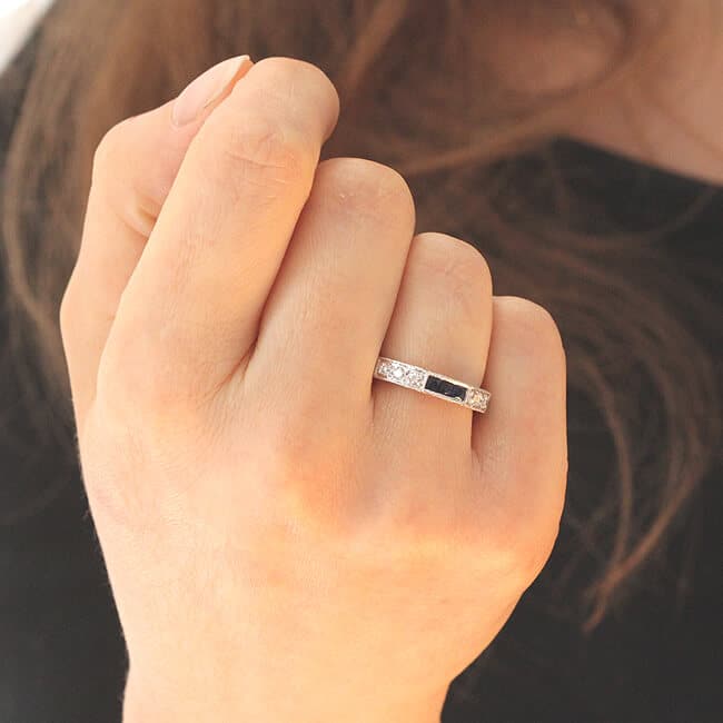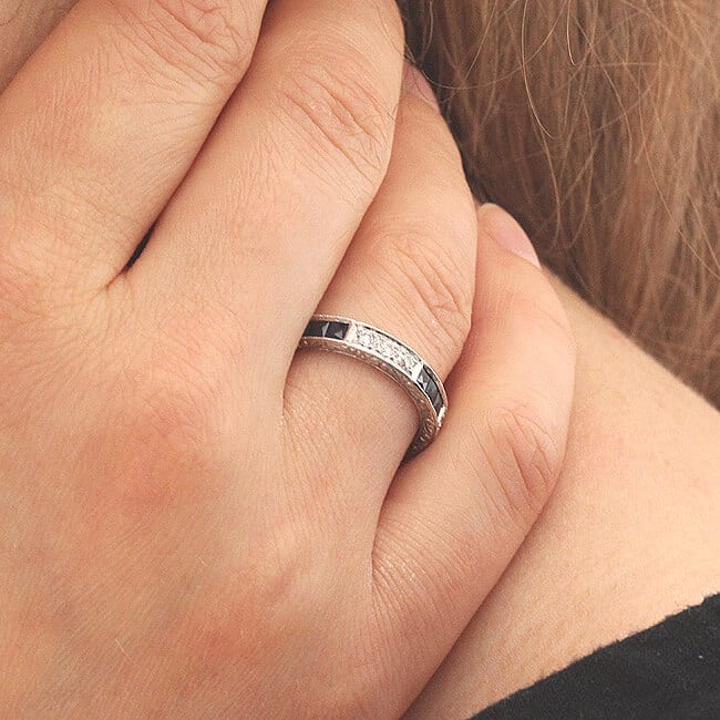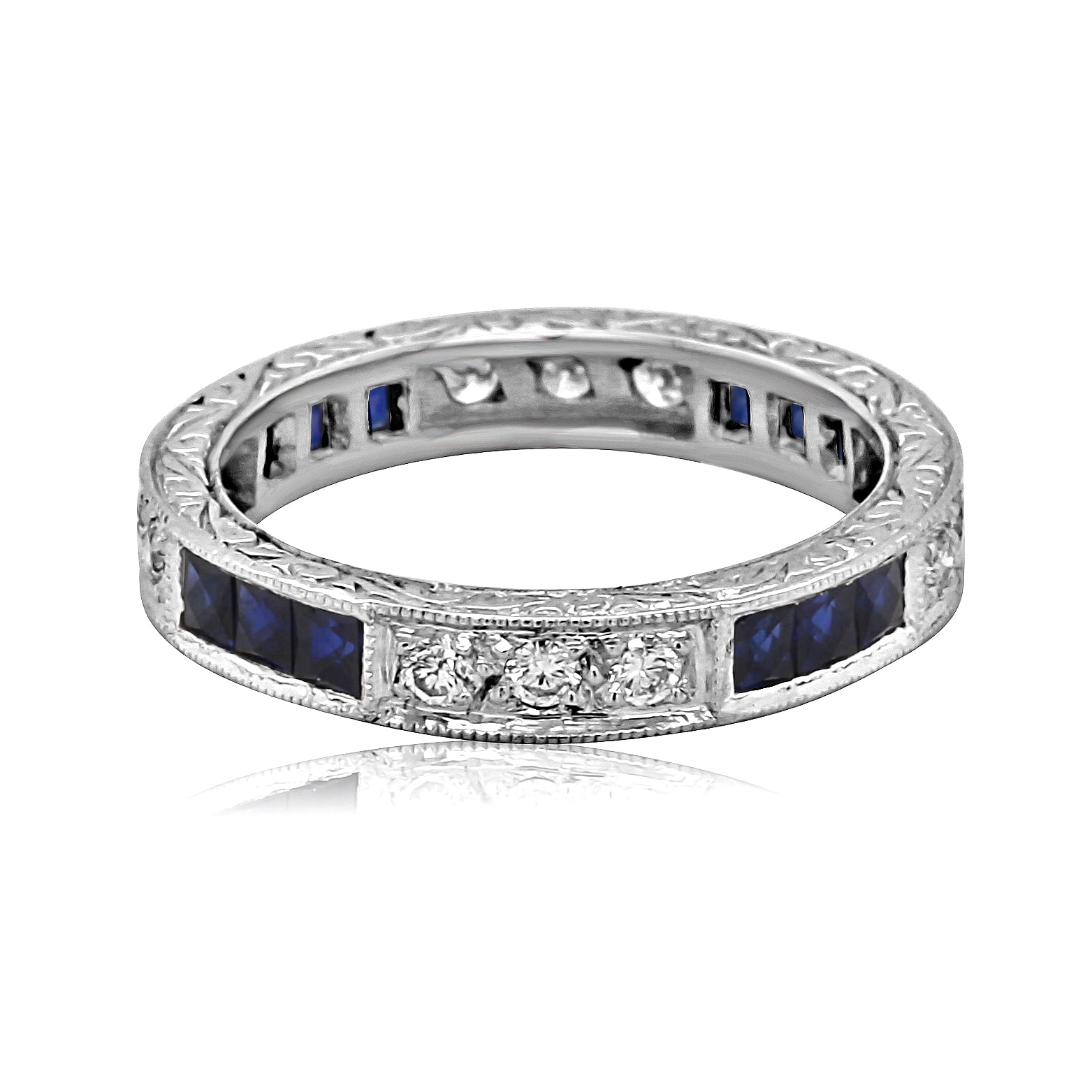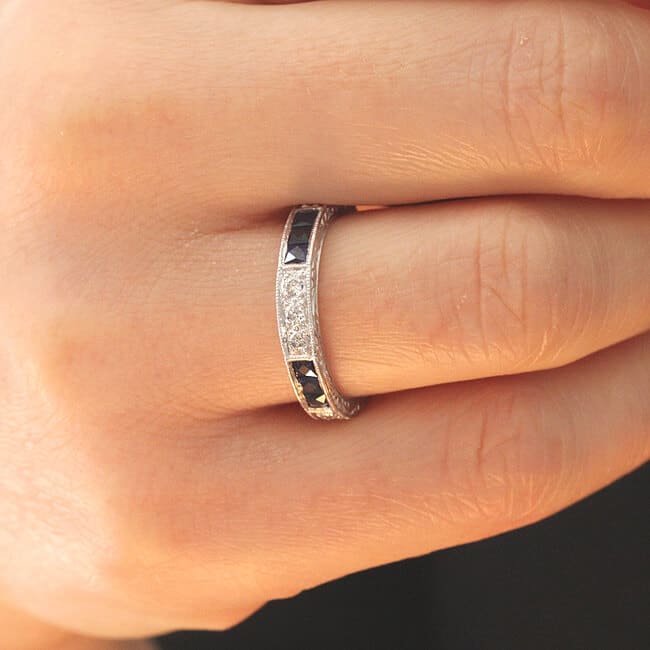 A timeless design inspired by Art Deco elegance, this sapphire and diamond band features intricate details and premium materials. Perfect as a wedding band, anniversary ring, or stackable piece.