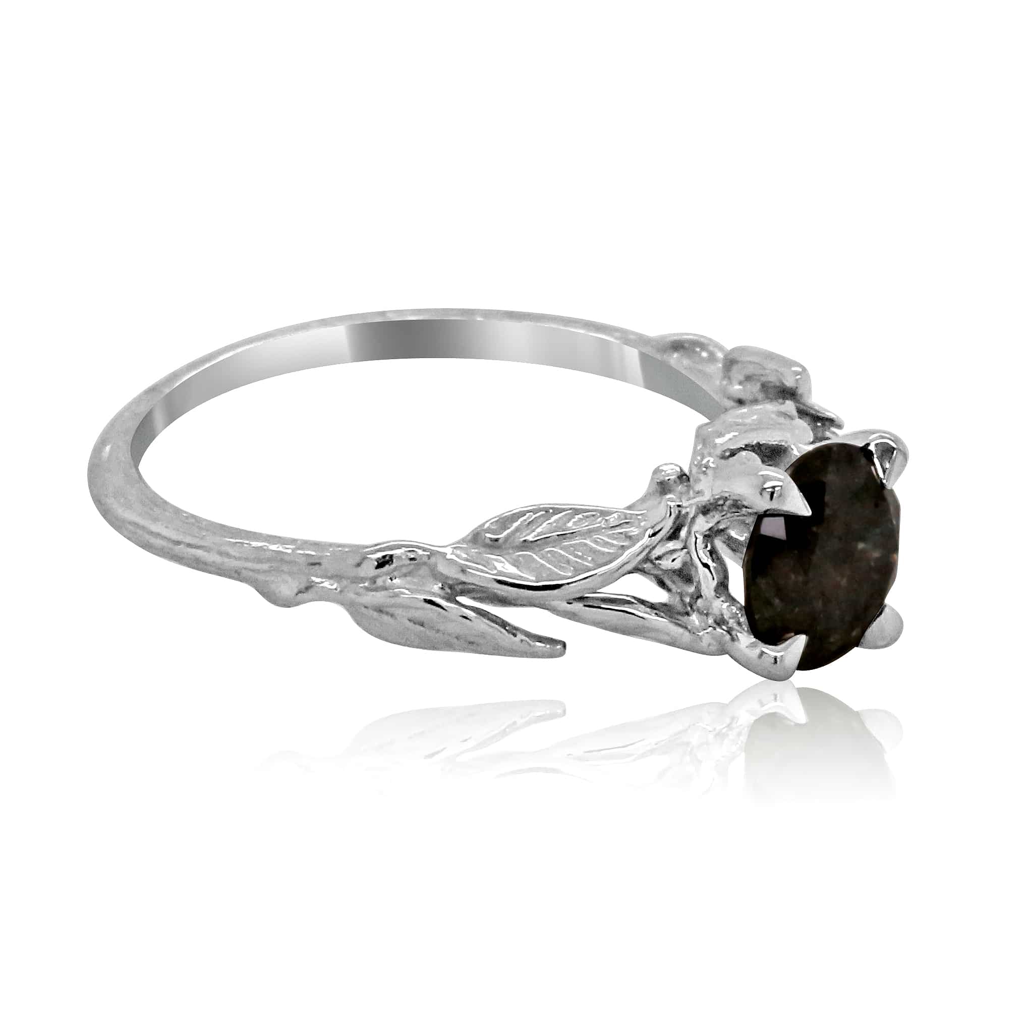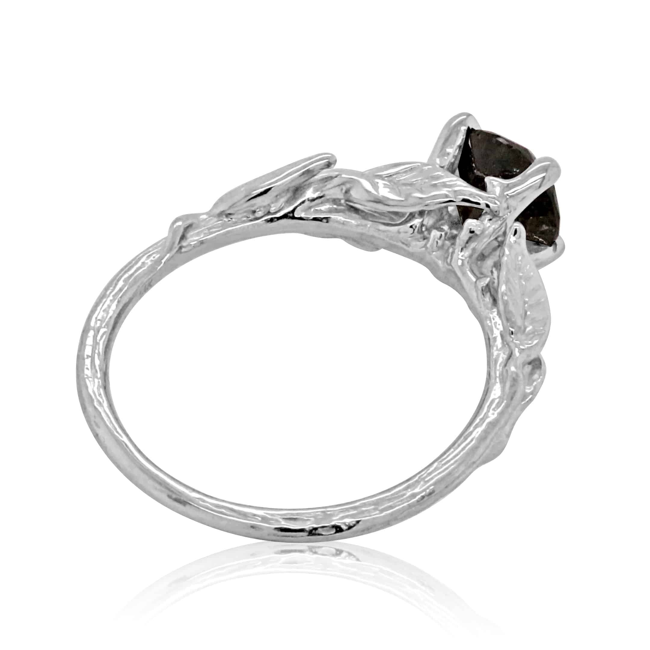 Expressing a romantic and whimsical allure, this nature-inspired engagement ring is crafted from 14K white gold. It showcases an approximately 6.5mm round black diamond elegantly secured in four prongs. The shank, adorned with leaf-like detailing, boasts a width of 4mm, and the center stone is gracefully elevated 6.4mm above the finger for a captivating presence.