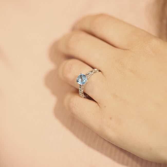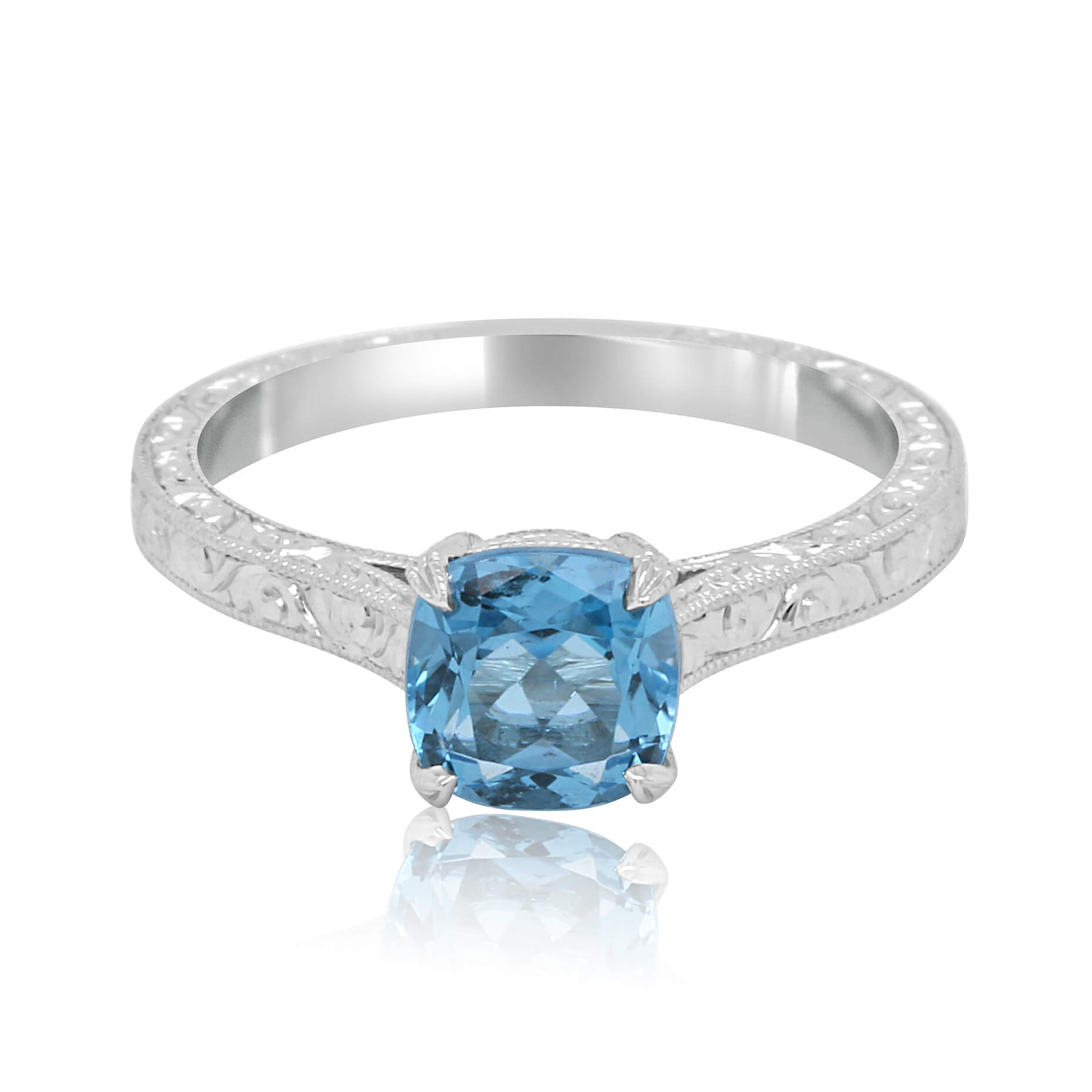 Crafted in platinum, this masterpiece features a captivating 7mm cushion-cut blue topaz, held securely in place by hand-etched prongs. The thoughtful addition of a sizing bar on the bottom of the shank ensures easy resizing in the future, providing both beauty and practicality.