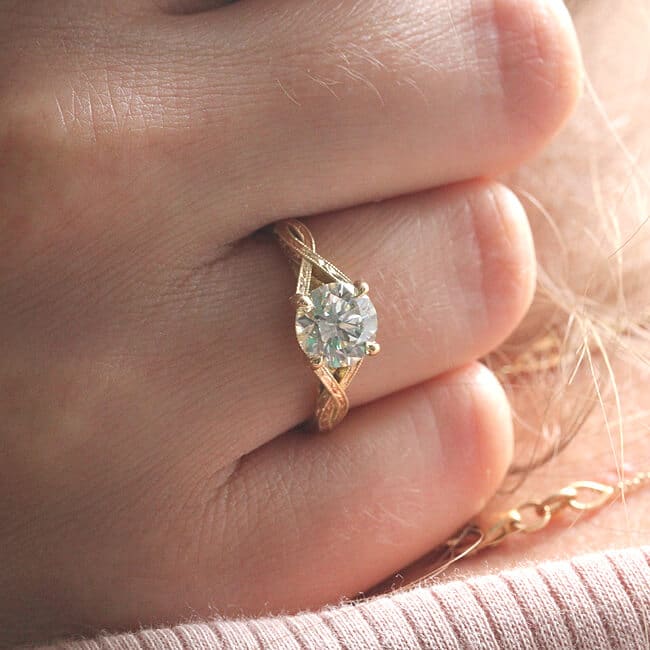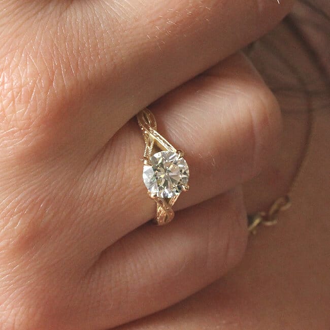 The shank measures approximately 2.4mm wide, offering a perfect balance of delicacy and durability. With its intricate design and high craftsmanship, this ring is ideal for those seeking a romantic, antique-style engagement ring with modern ethical values.
