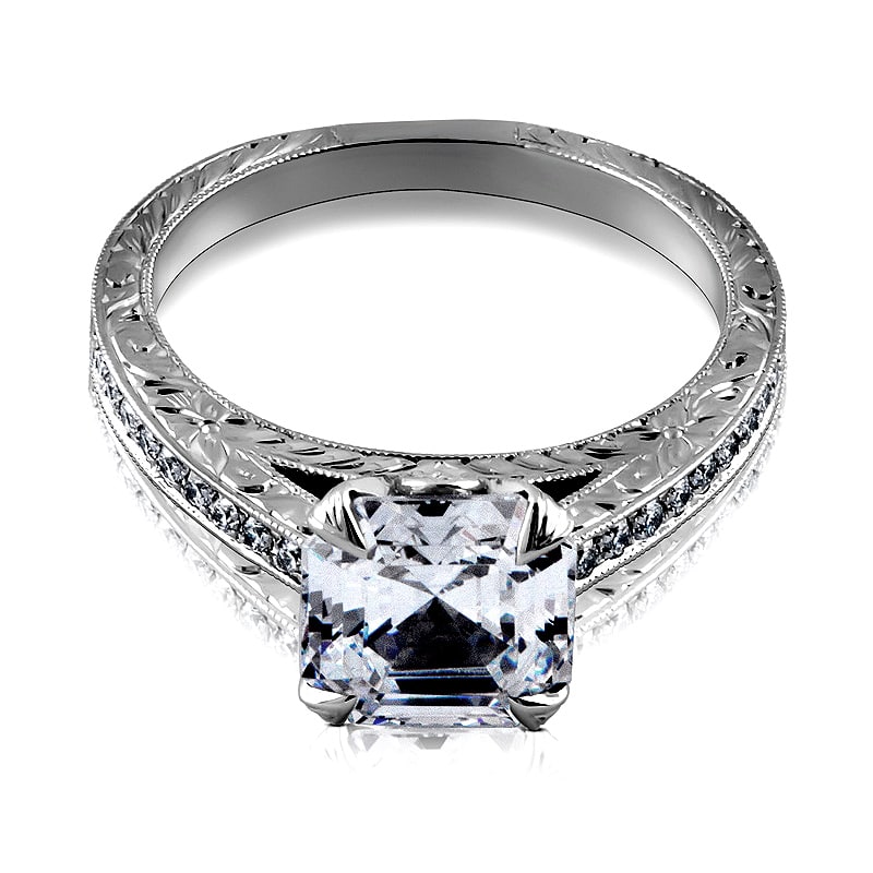 Cathedral Vintage 2ct Asscher Engagement Ring – Hand Engraved Art Deco Design