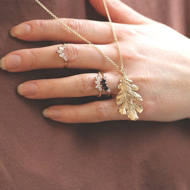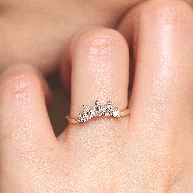 This elegant band features three pear-shaped lab-grown diamonds (4×2.5mm) and two round lab diamonds (2.0mm). The diamonds’ brilliant sparkle contrasts beautifully with the warm gold, offering a striking, ethical, and eco-friendly alternative to mined stones.