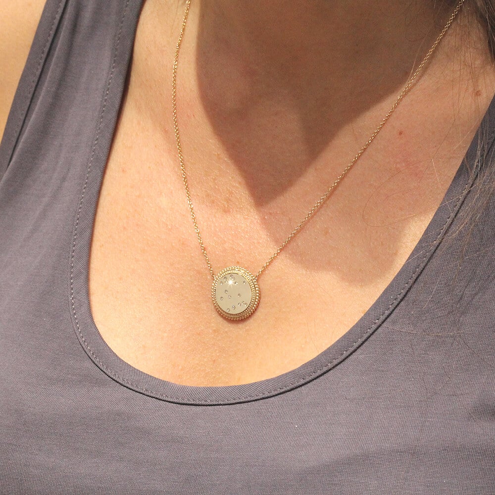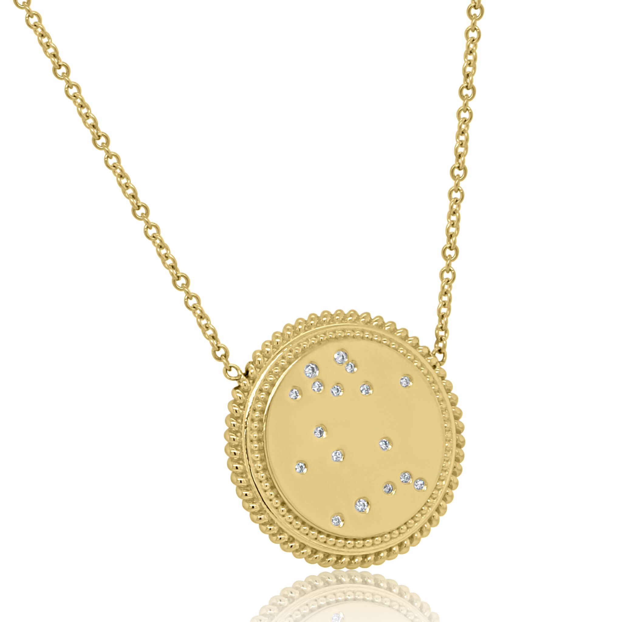 The diamonds in this pendant beautifully depict the positions of stars in the Gemini Constellation. They are skillfully burnish set, while the back of the pendant features a sandblast finish. With a diameter of 19mm and an ornate halo, this pendant is truly captivating.