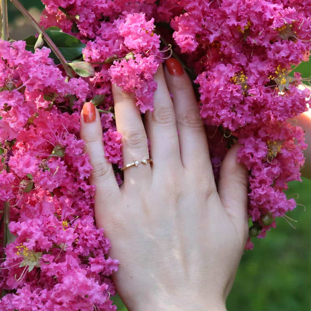The band has a sleek geometric shape with a high-polished, 9-plane design, making it stand out while still feeling understated. It’s 1.5mm wide at the shank and 4mm wide at the top, giving it a lightweight feel that’s comfortable enough to wear all day.