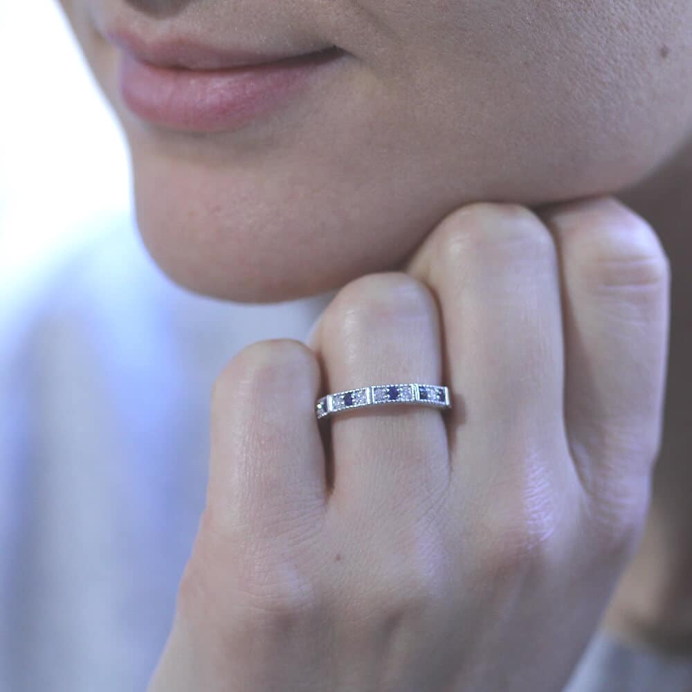 Art Deco style inspired wedding band contains six prong set, natural, round diamonds .15cttw, G-SI1 quality and six round, blue sapphire approx .15cttw.