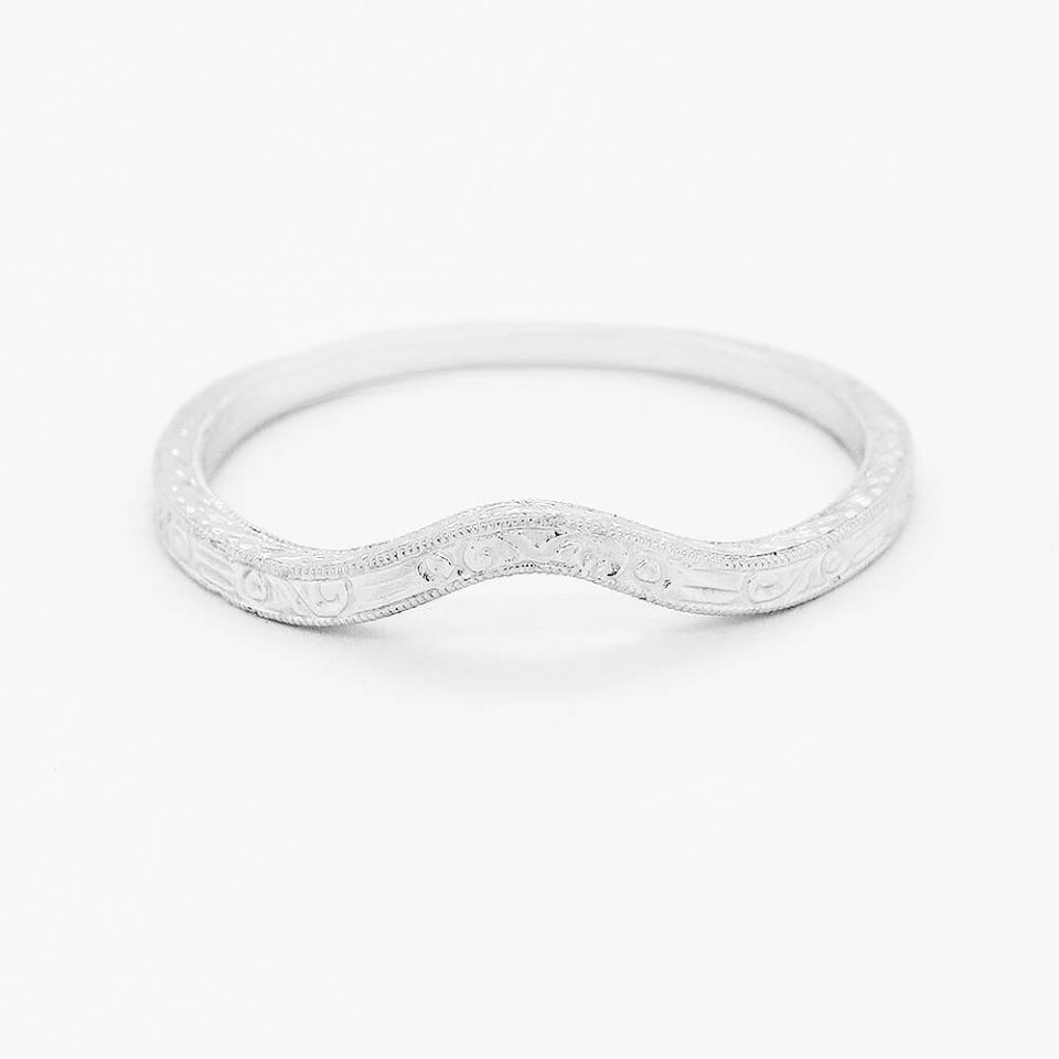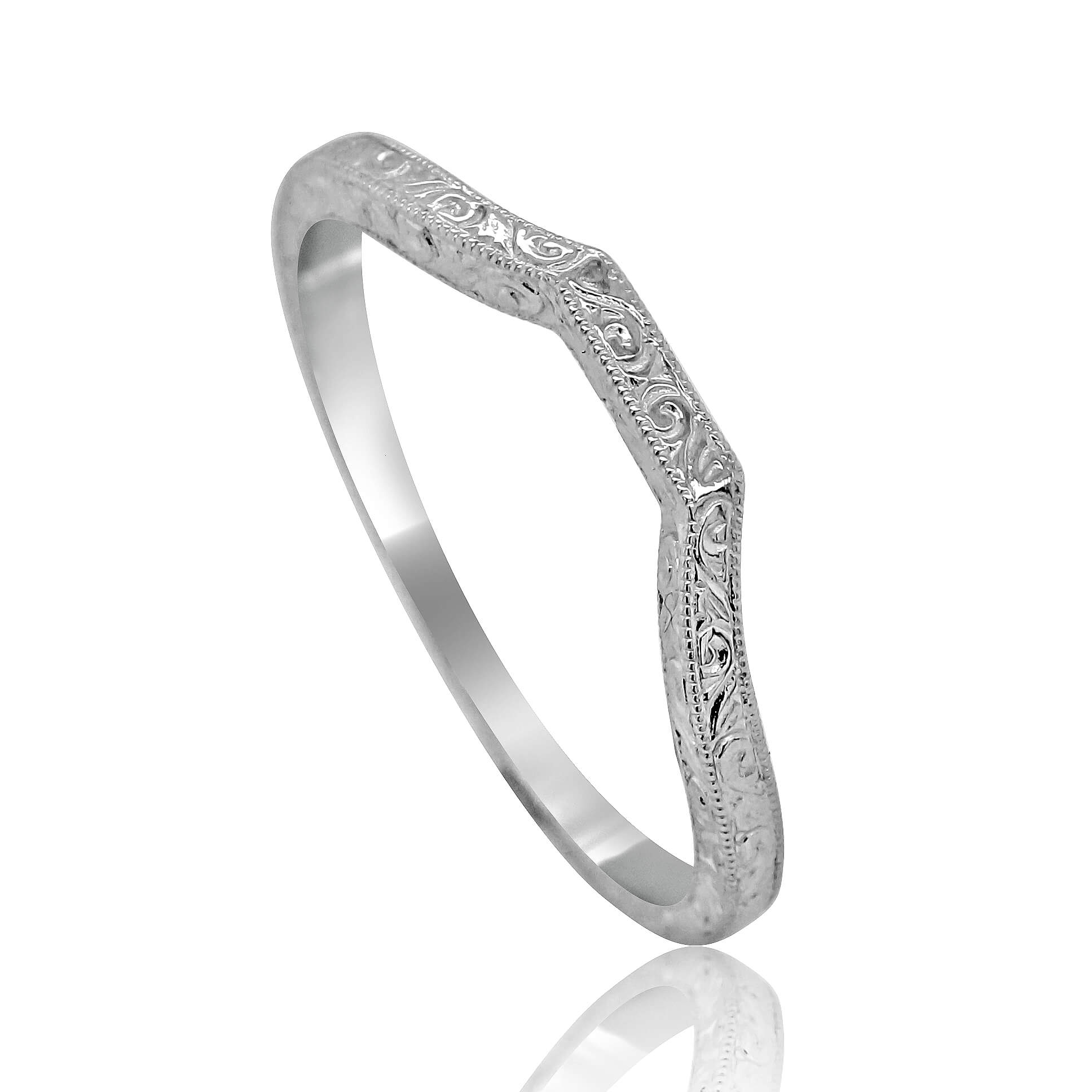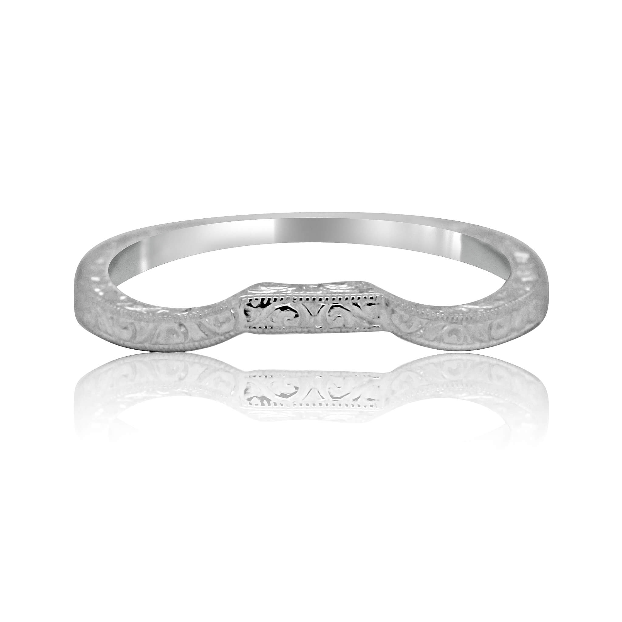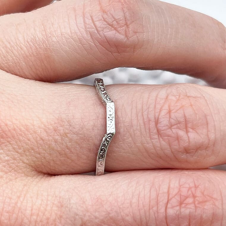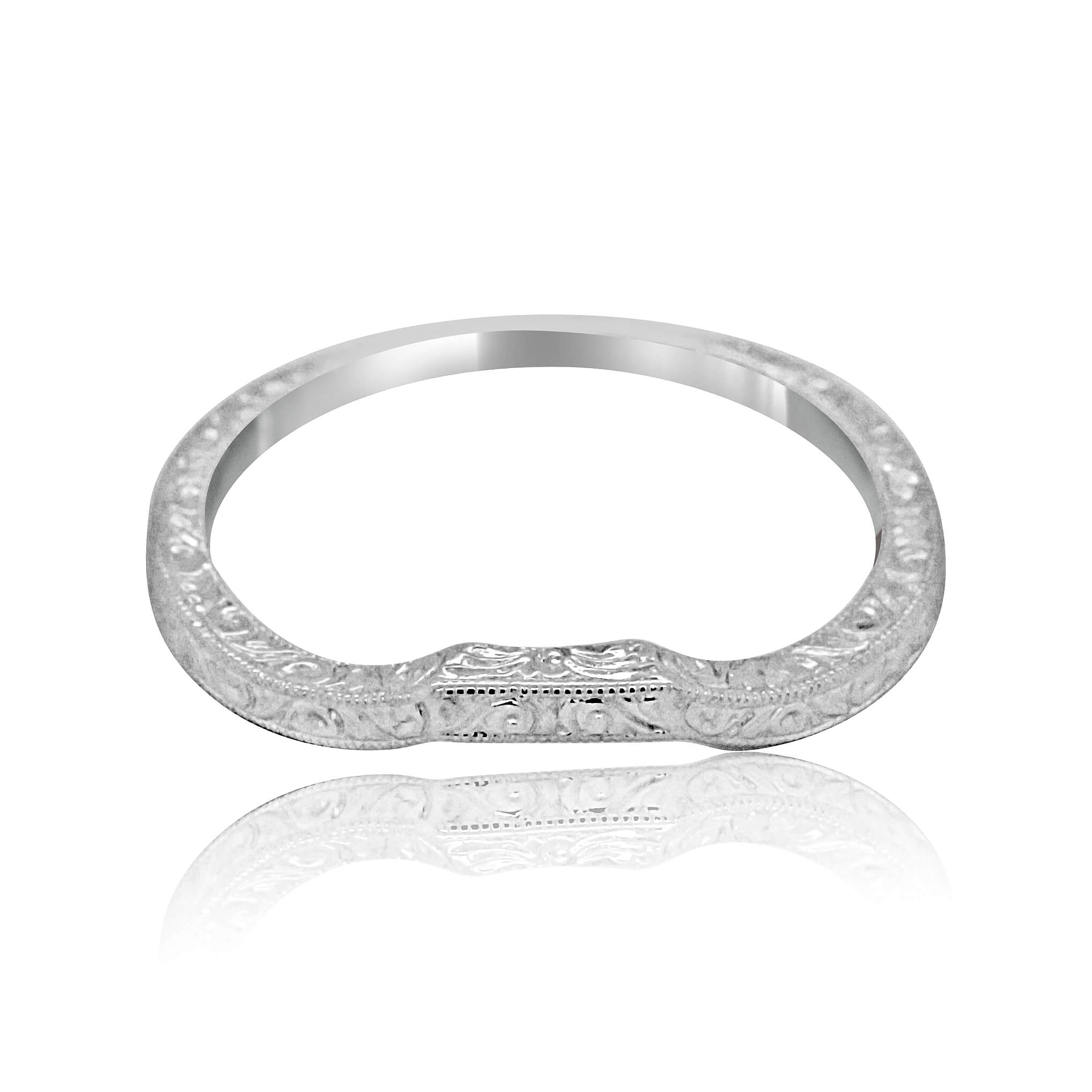 Handcrafted in your choice of 14K yellow gold, rose gold, or platinum 950, this delicate curved wedding band features an elegant vintage-inspired silhouette. The band is adorned with intricate hand-engraved details along the top and sides, while fine milgrain edges add a refined, antique touch.