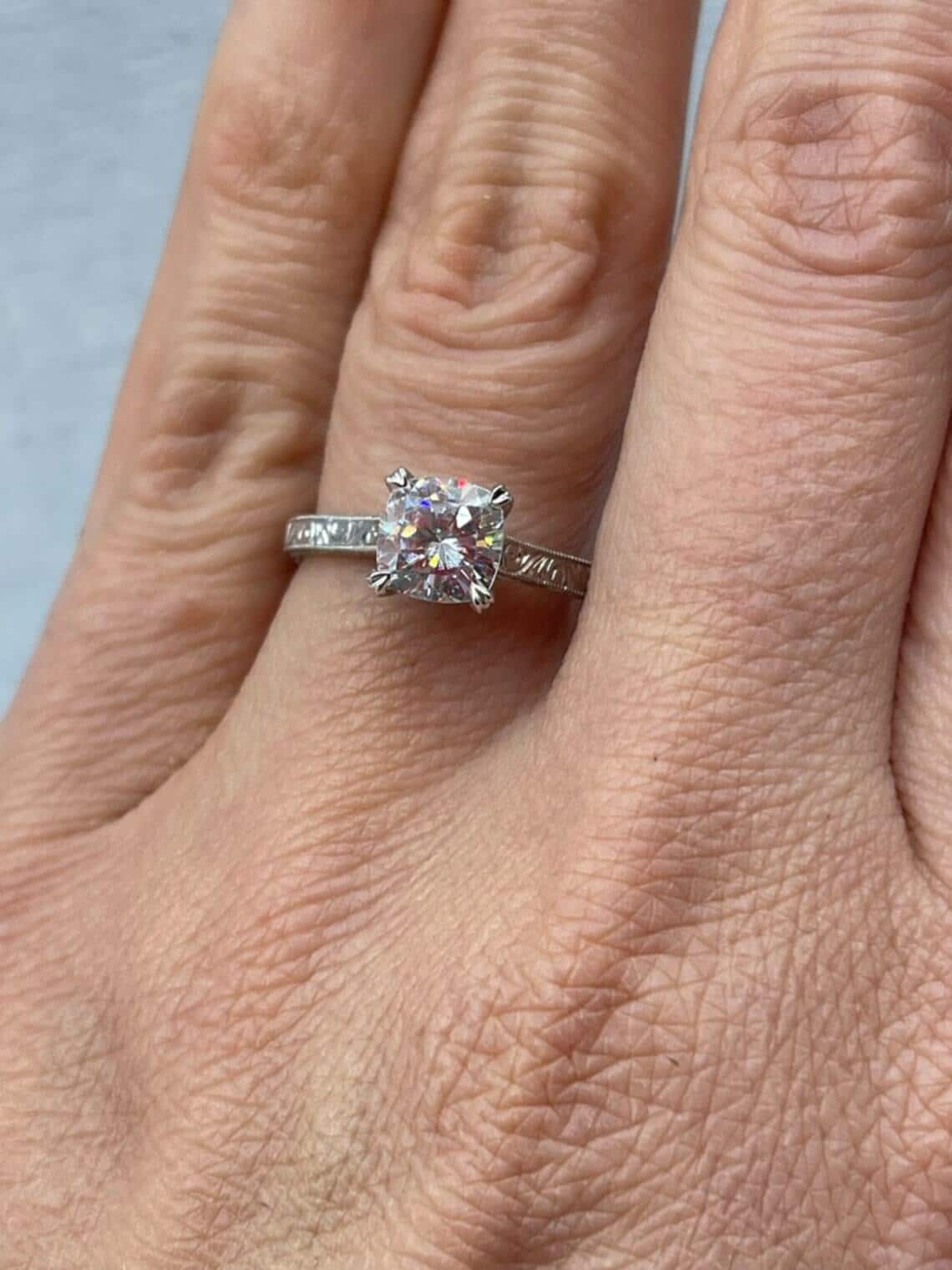 Vintage Lab-Created Cushion Diamond Engagement Ring (Hand-Engraved, 14K White Gold)