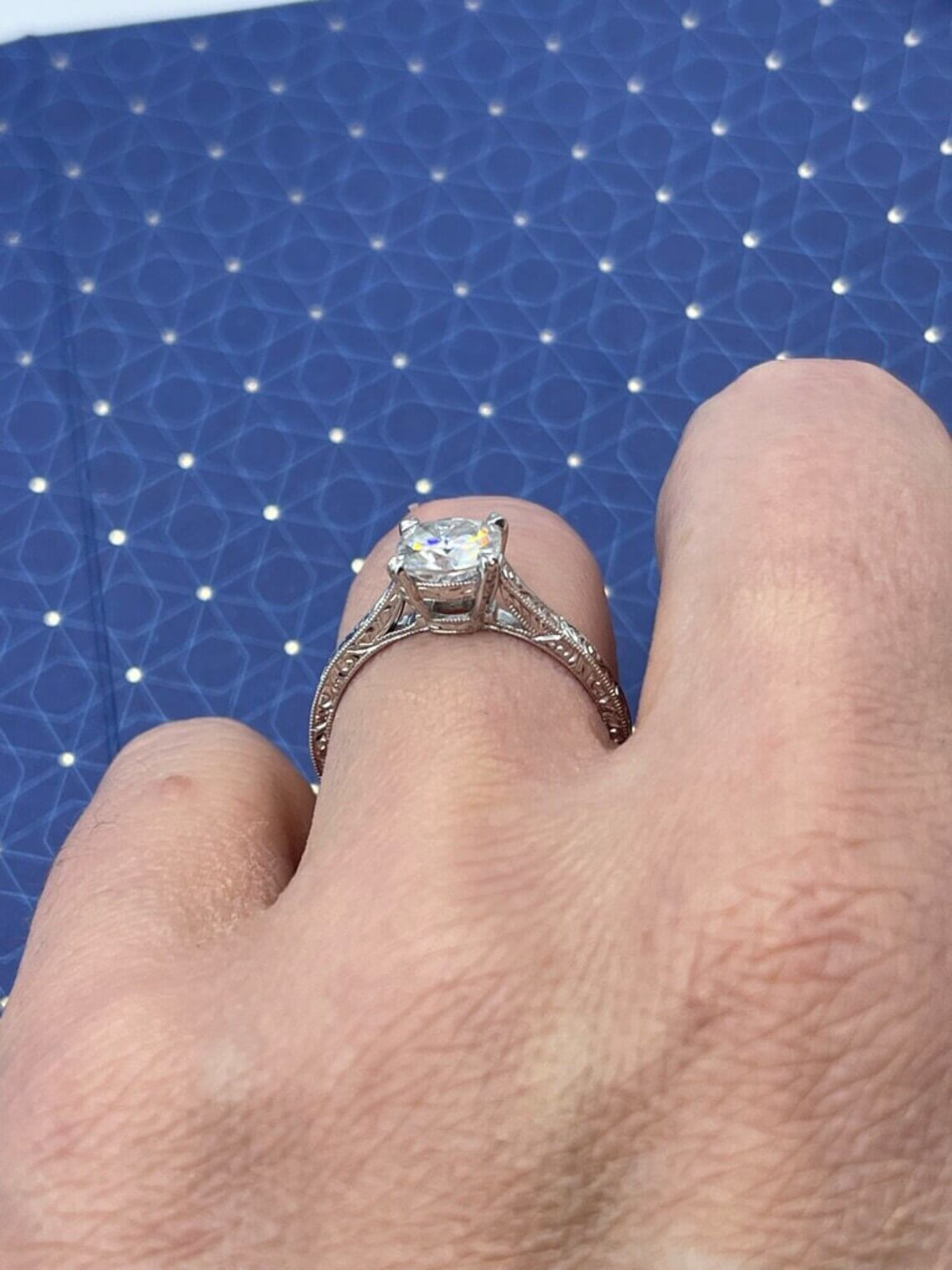 Moreover, the diamond’s cut and setting work together to maximize fire and scintillation. The center stone sits about 6 mm above the finger, creating a graceful profile that pairs beautifully with straight or curved wedding bands. And because each ring is handmade and hand-carved, yours will carry subtle, one-of-a-kind character.
