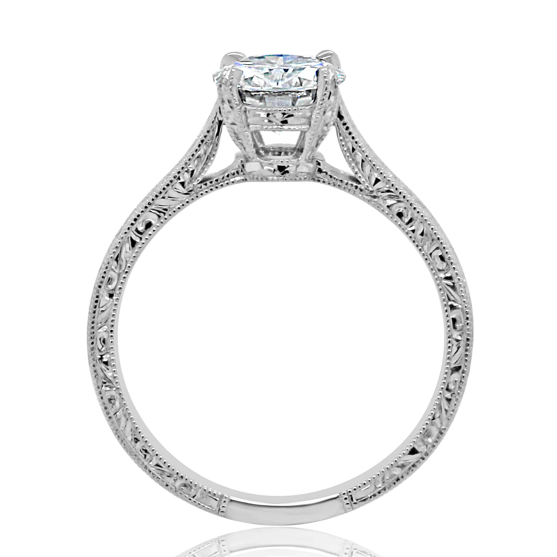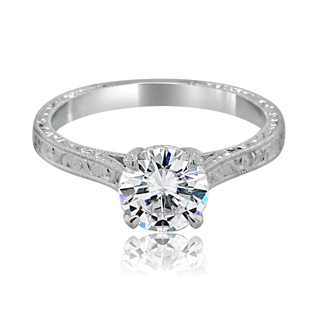 Superbly crafted, perfectly balanced, hand engraved vintage style engagement ring with a Forever One Moissanite center by Charles & Colvard.